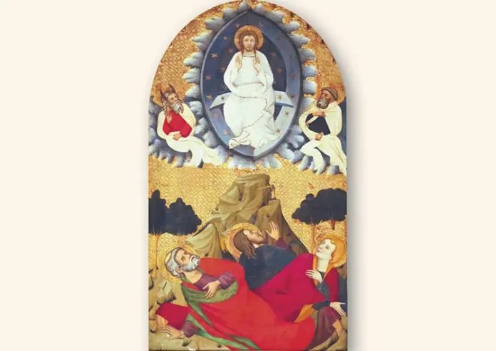 Three Apostles and two prophets before God made Man, who on the summit of Mount Tabor shows Himself in all His splendour. This is the magnificent and sublime scene of the Transfiguration! An unfathomable spectacle, witnessed on earth by Peter, James, and John, and the representatives of the blessed, the great Moses and Elijah: “And He was transfigured before them; His face shone like the sun and His clothes became white as light” (Mt 17:2).